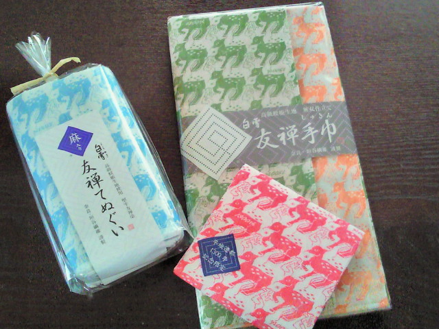 気になっていた「白雪ふきん」と手ぬぐいを数種類。白雪ふきんは化学繊維が入ってるってどーよ?と思いながら、鹿さんにつられてお買い上げ。